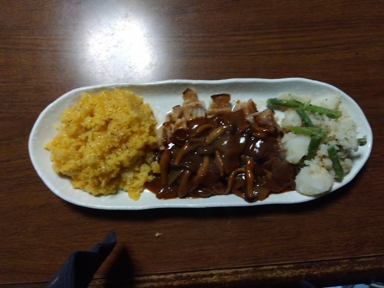 見た目は豪華なのに、簡単にできるポークソテーはいかがでしょうか。デミグラスソースをかければ食べ応えがあって、赤ワインにもよく合う一品のでき上がります。つけ合わせには、ホクホクと粉ふきにしたじゃがいもと冷やご飯を使った簡単リゾットを添えてみました。